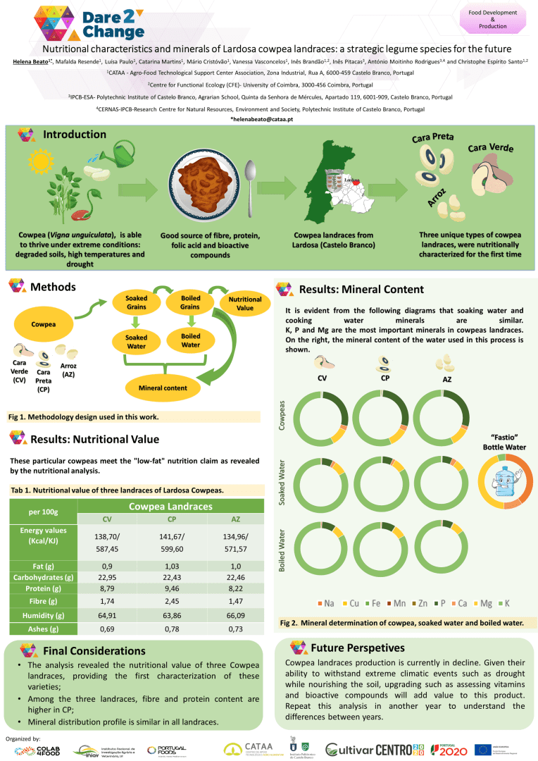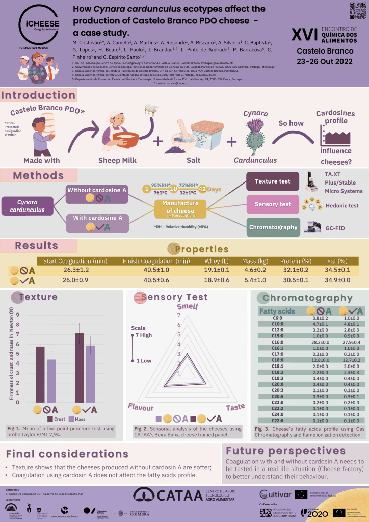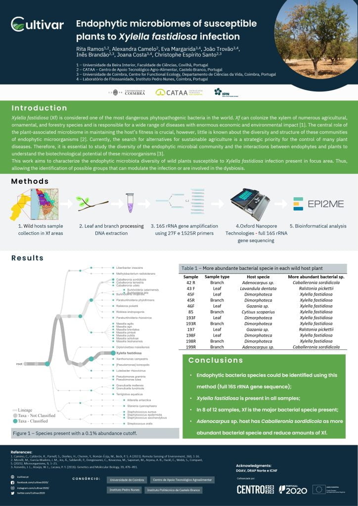 Endophytic microbiomes of susceptible plants to Xylella fastidiosa infectionIII International Meeting of the Portuguese Society of Genetics Aplicação de Atmosferas controladas na conservação pós colheita da castanhaIV Simpósio da Castanha, Vila Real, Portugal. 2022.Prémio de Melhor Poster🥇 Crispy orange A multi-purpose ready-to-eat snackInnovation in Mediterranean Traditional Foods: novel products and processes. Bragança, Portugal. 2022.Prémio de Melhor Poster🥇 How Cynara cardunculus ecotypes affect the production of Castelo Branco PDO cheese- A case studyXVI Encontro Química dos Alimentos, Castelo Branco, Portugal. 2022. Quince evaluation for production of unfiltered vinegarDare2Change, Porto, Portugal. 2023. How dehydration affects the Strawberry Tree FruitDare2Change, Porto, Portugal. 2023. Menção Honrosa 🥇 The Kombucha Secret - Scoby's Microbiome Study and Probiotic Bacteria IdentificationDare2Change, Porto, Portugal. 2023. Quality of Beira Baixa “Queijo Amarelo” (Yellow Cheese) P.D.O. - Effect of Production Season on Microbiological QualityDare2Change, Porto, Portugal. 2023. Nutritional characteristics and minerals of Lardosa cowpea landraces : a strategic legume species for the futureDare2Change, Porto, Portugal. 2023.